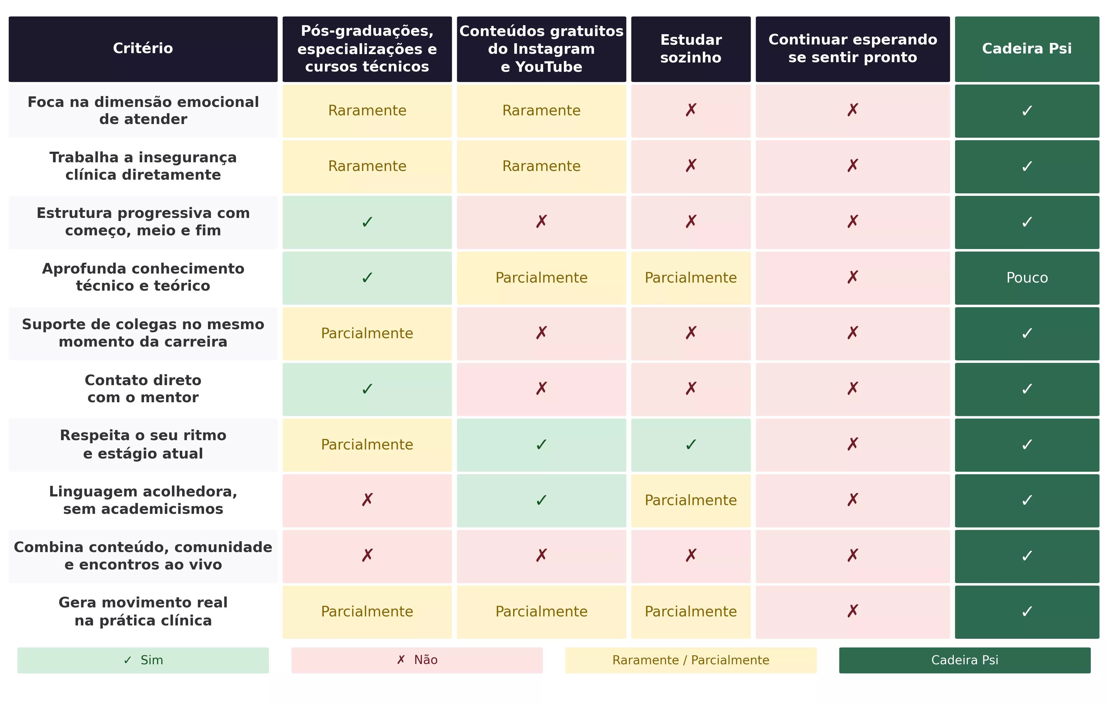 Importante! Pós-graduações, especializações e cursos técnicos são parte essencial da formação de qualquer psicólogo. Eles aprofundam o conhecimento teórico, desenvolvem competências clínicas específicas e são insubstituíveis na construção de uma carreira sólida. O Cadeira Psi não compete com essas formações. Ele existe para preencher o que elas, por natureza e propósito, não foram criadas para oferecer: o trabalho emocional e relacional de quem está aprendendo a sentar na cadeira de psicólogo pela primeira vez.
